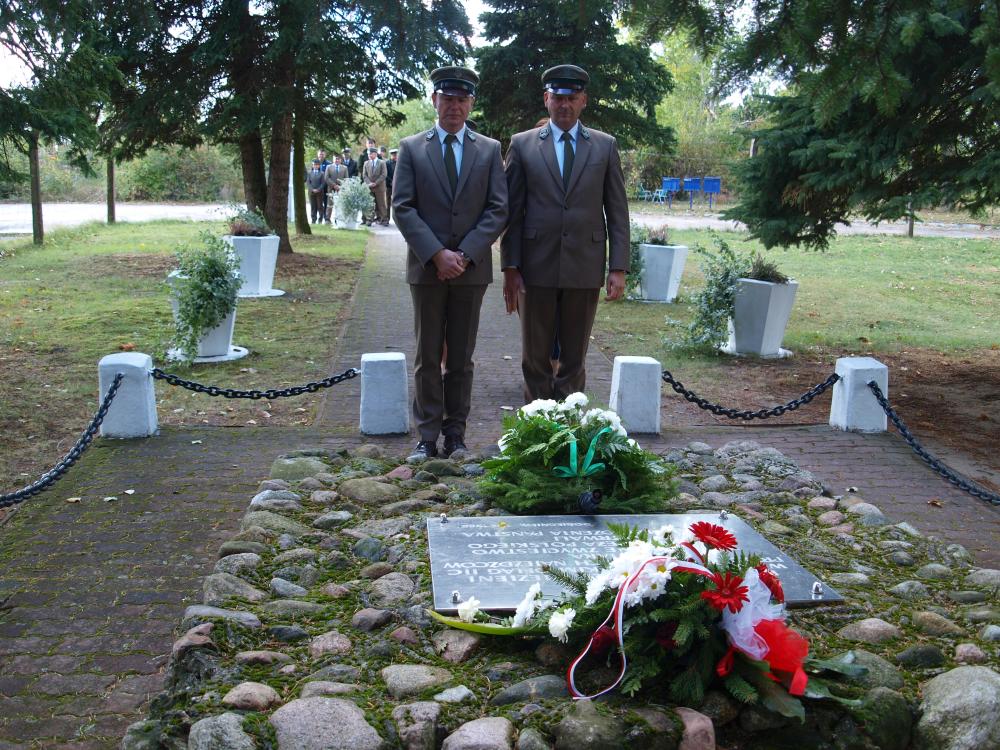 Leśnicy w mundurach galowych podczas składania biało - czerwonej wiazanki kwiatów przy tablicy upamiętniającej polskich żołnierzy wiezionych w obozie jenieckim - Apel Niepodległości 2018 rok