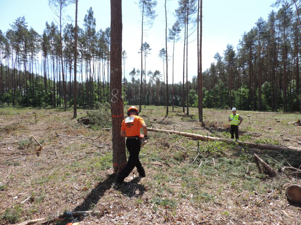 Zawodnik podczas Zawodów Drwali ubrany w pomarańczowy strój ochronny przygotowujący się do ścinki drzewa. Na drugim planie sędzia w odblaskowej kamizelce na tle lasu - 2018 rok