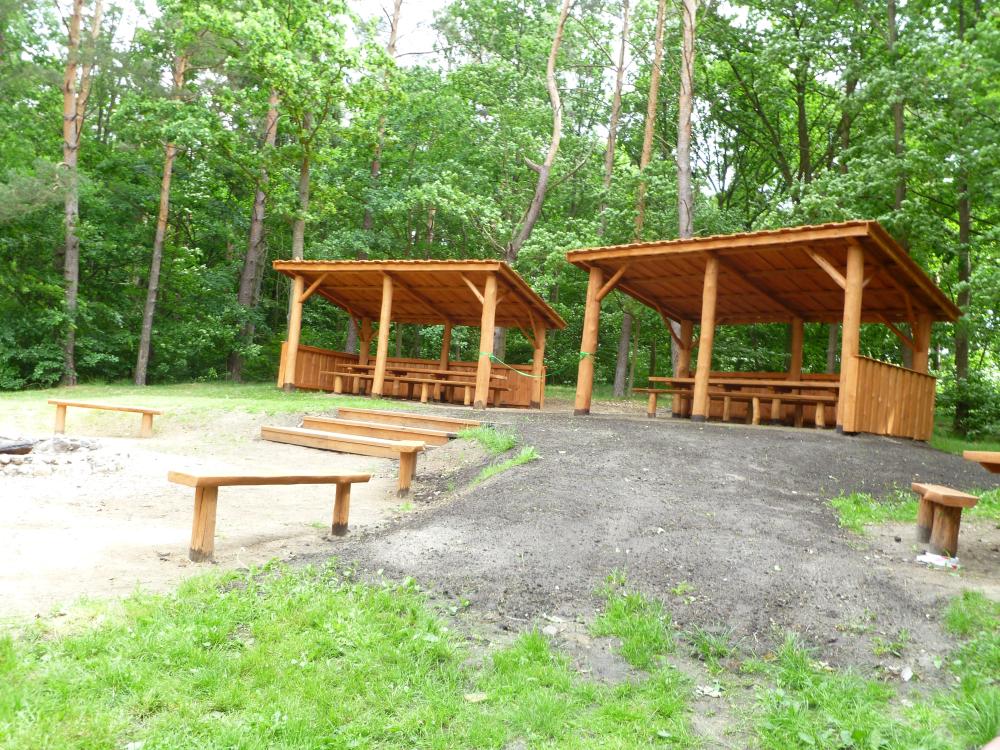 Świeżo wyremontowane drewniane wiaty ze stołami ne tle lasu - 2012 rok