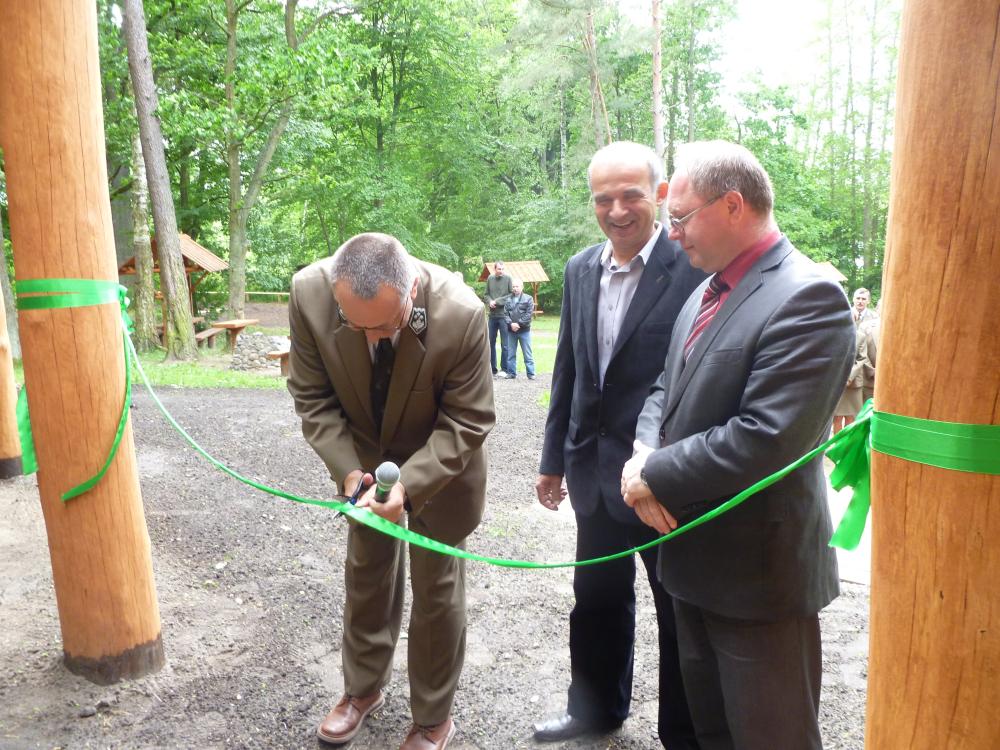 Osoby dokonujące symbolicznego przecięcia wstęgi na otwarciu zmodernizowanych drewnianych wiat - 2012 rok