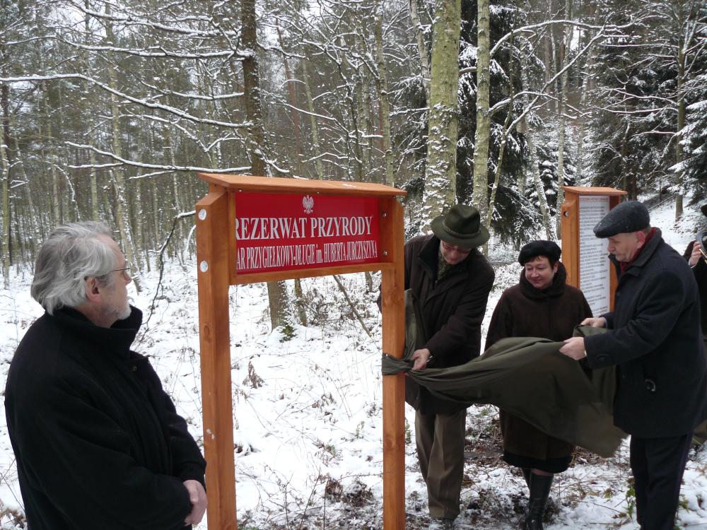 Grupa osób uroczyscie odsłania tablicę z okazji nadania rezerwatowi przyrody Mszar Przygiełkowy imienia Huberta Jurczyszyna - 2010 rok