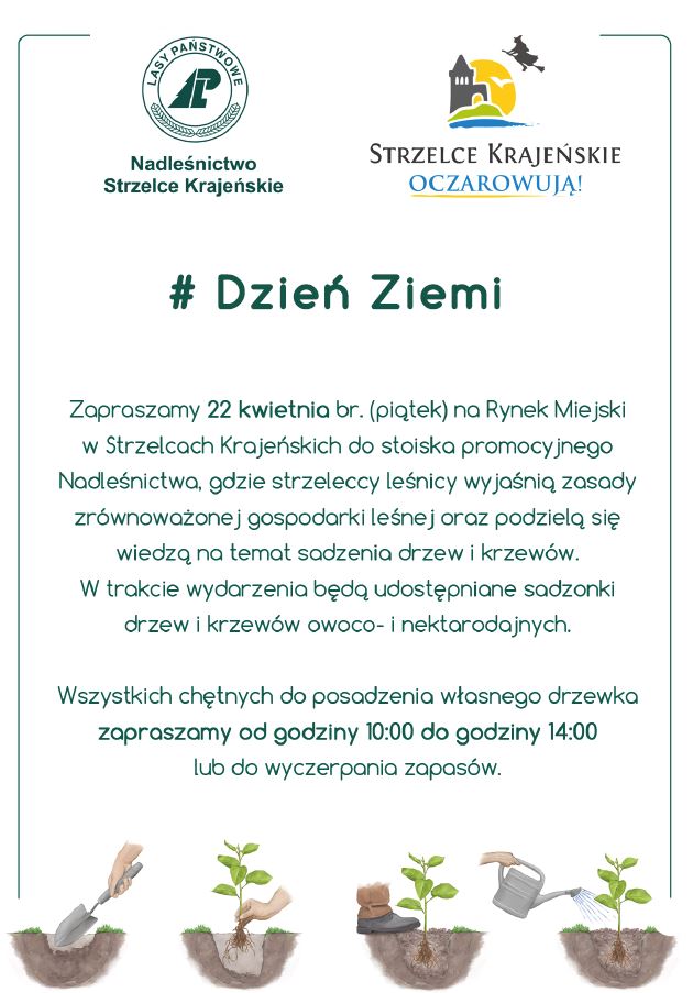 Zapraszamy 22 kwietnia br. (piątek) od godziny 10:00 na Rynku Miejskim w Strzelcach Krajeńskich do stoiska promocyjnego Nadleśnictwa, gdzie strzeleccy leśnicy wyjaśnią zasady zrównoważonej gospodarki leśnej oraz podzielą się wiedzą na temat sadzenia drzew i krzewów. W trakcie wydarzenia będą również udostępniane sadzonki drzew i krzewów. Będą to gatunki owoco- i nektarodajne, które doskonale nadają się do wzbogacania ekosystemów, do tworzenia korytarzy pokarmowych oraz ostoi dla ptaków, owadów i ssaków. W czasie kwitnienia rośliny te, stanowią doskonałą bazę do zbioru pożytku pszczelego.